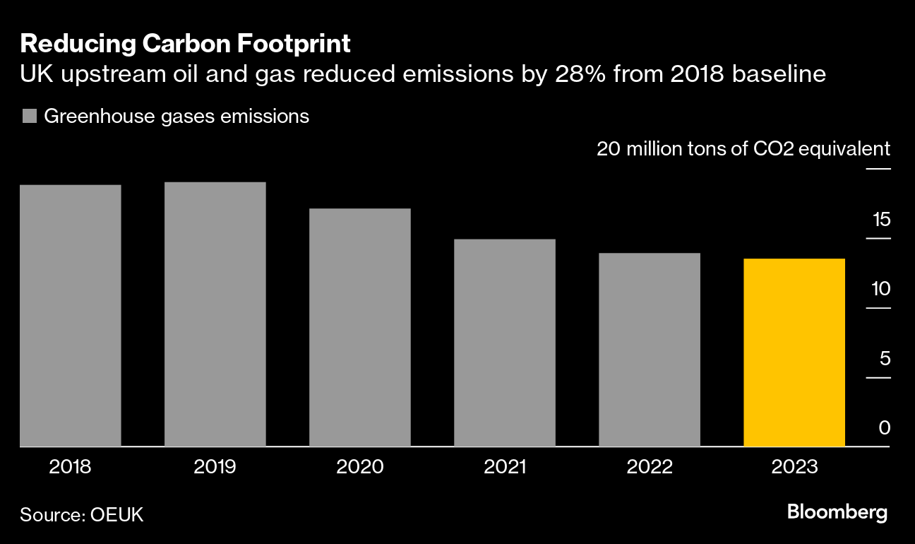 (Bloomberg) -- The UK’s offshore oil and gas industry reached its 2027 target for cutting emissions four years earlier than promised by making power systems more efficient, and reducing flaring and venting, a lobby group said Tuesday.