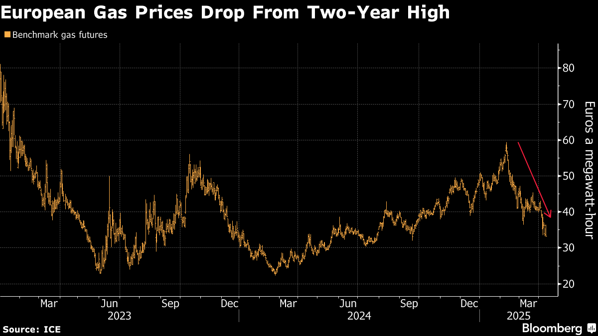 The plan to secure more leeway to fill storage, combined with the fallout of the trade war, has helped spark a sharp drop in prices. European gas futures this week hit the lowest since September, extending a retreat from February’s two-year high. Energy costs are a key concern for EU officials and governments.