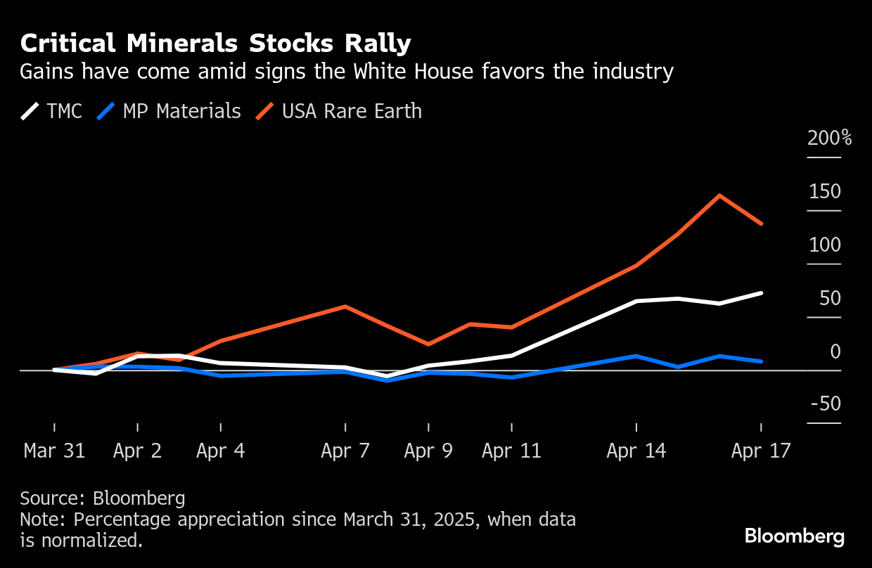 Trump’s moves have made the three stocks winners even as his trade war has punished broader markets. TMC and MP Materials are up double digits since Feb. 19, a period that’s seen the S&P 500 Index fall 14%. Rare Earth USA shares have been volatile since the firm went public last month by merging with a special-purpose acquisition company, but they’ve more than doubled this month.
