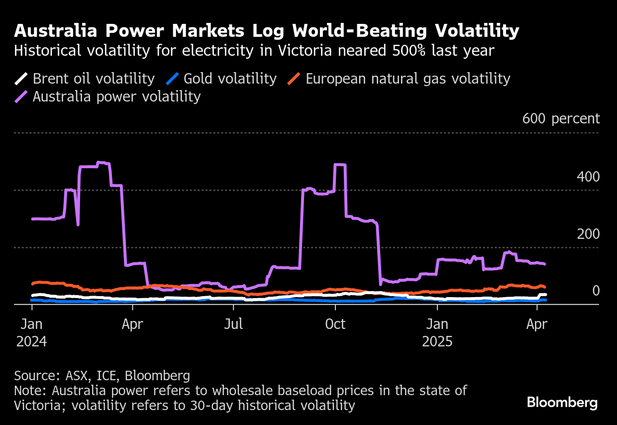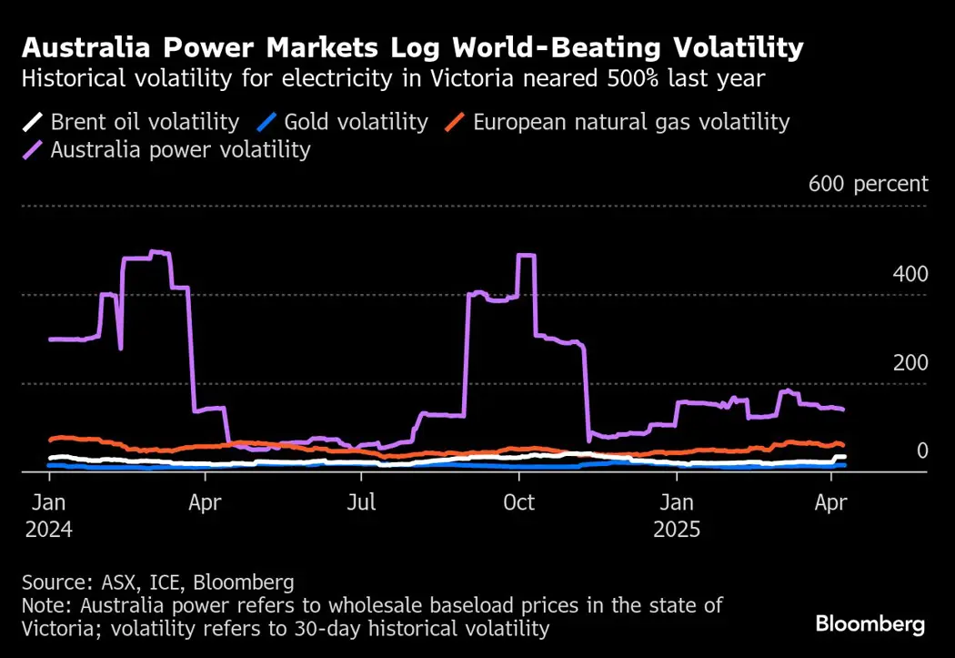 Australia has a large, mature electricity market with relatively few players and plenty of space for new arrivals. The 30-day historical volatility for power prices in the Australian state of Victoria — a measure of deviation from its past average — reached nearly 500% last year. In contrast, European natural gas recorded levels of as much as 78%.