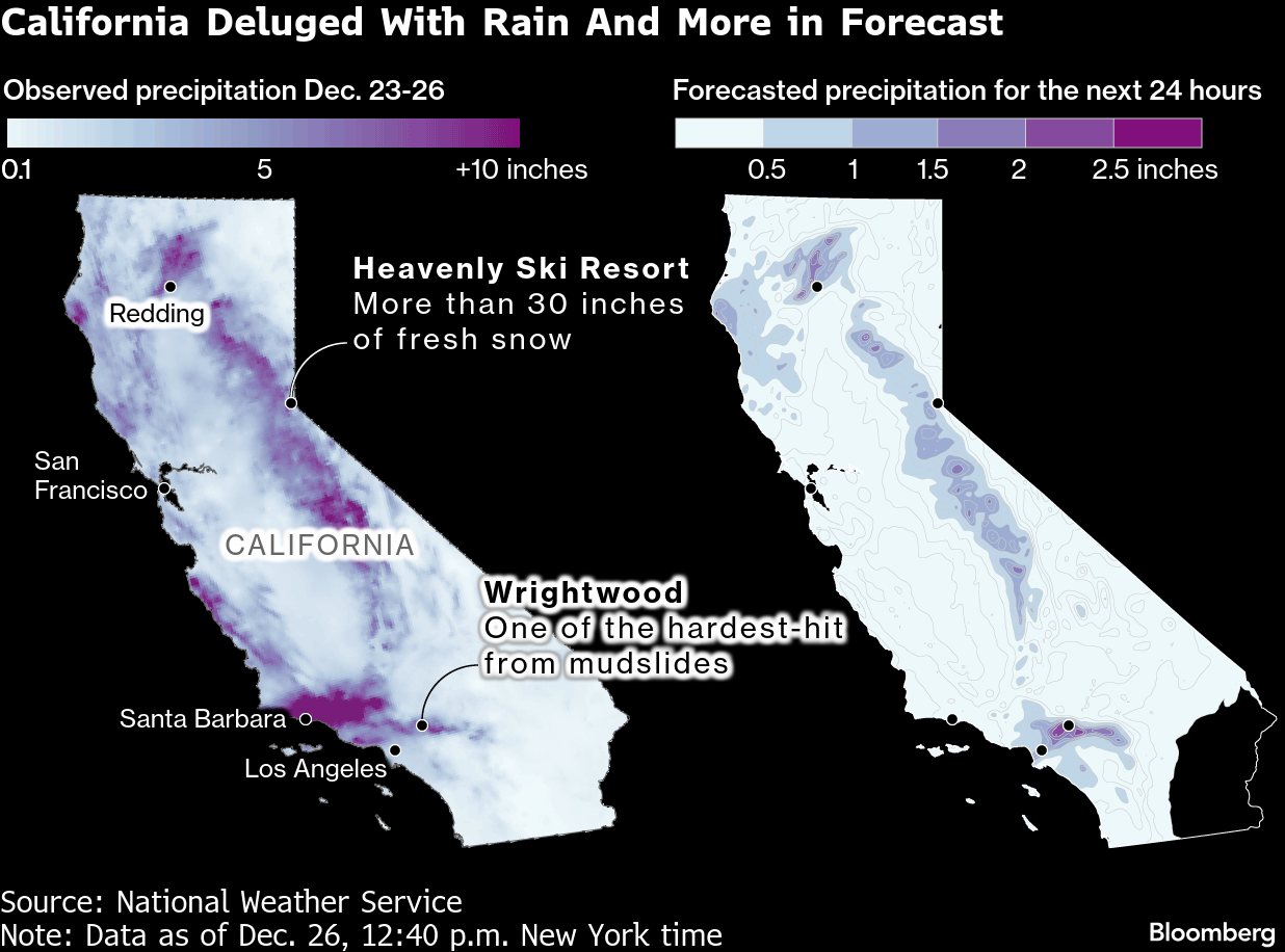 (Bloomberg) -- California is facing another day of heavy rain and risks of flash floods, prompting officials to warn about the dangers for road travel in this busy holiday period.