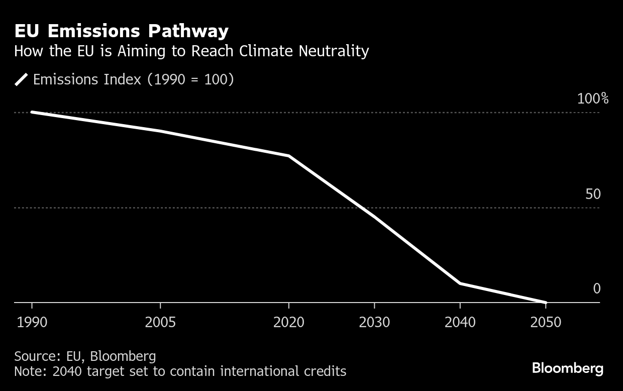 (Bloomberg) -- The European Union clinched a deal to reduce greenhouse gases by 90% through 2040 compared with 1990 levels, a target that seeks to keep the bloc on track to reach net zero by the middle of the century.