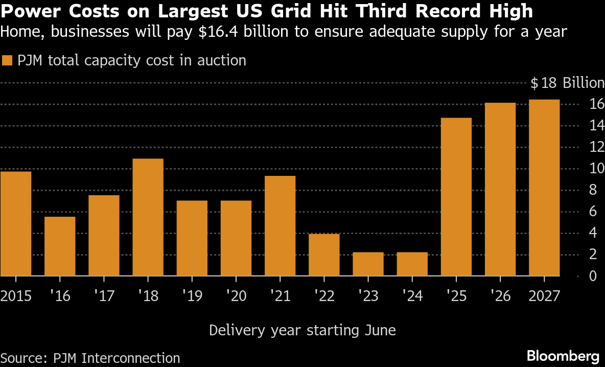 Households and businesses from New Jersey to Chicago will pay a record $16.4 billion to secure electricity starting in 2027, according PJM Interconnection LLC, which operates the 13-state grid that serves nearly one-fifth of Americans. The fee is a charge to ensure access to supplies, but doesn’t include the costs of power used.