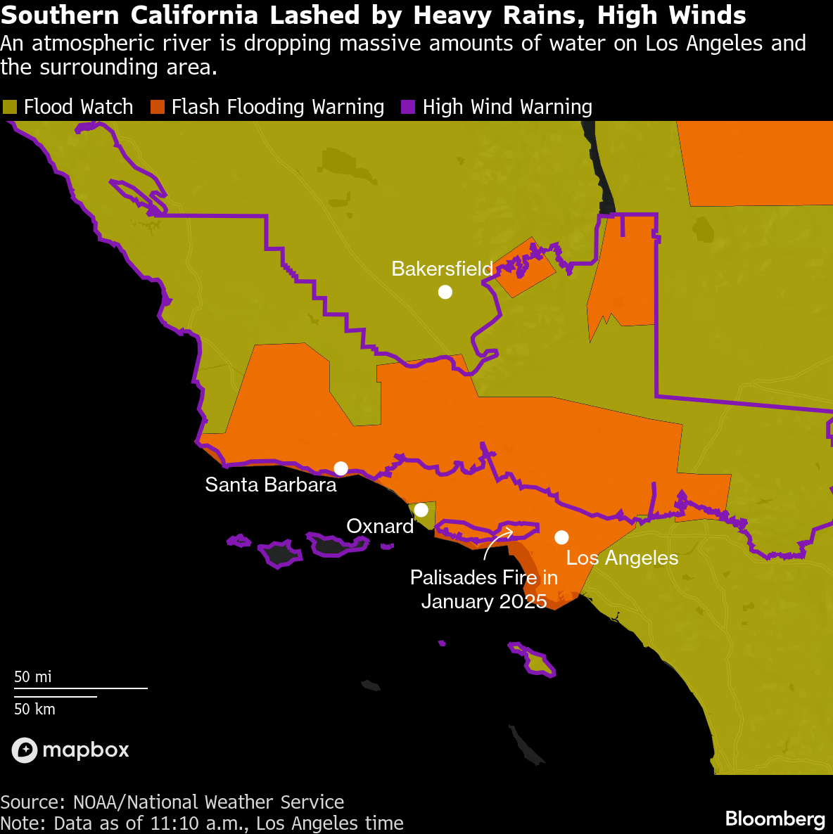 (Bloomberg) -- A powerful winter storm is lashing Southern California, prompting California Governor Gavin Newsom to proclaim a state of emergency in Los Angeles and neighboring counties. Coastal communities are bracing for multiple months’ worth of rain in just a few days, while areas charred by wildfires face the risk of mudslides.