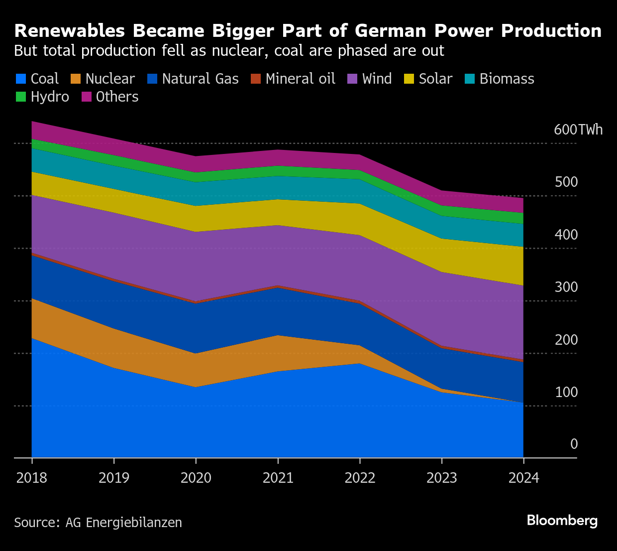 The problem now is that grid expansion can’t keep track with the added capacity, so part of that green energy remains unused. After exiting nuclear power two years ago, the nation also lacks backup capacity for periods of “Dunkelflauten,” when there’s no wind and skies are overcast.