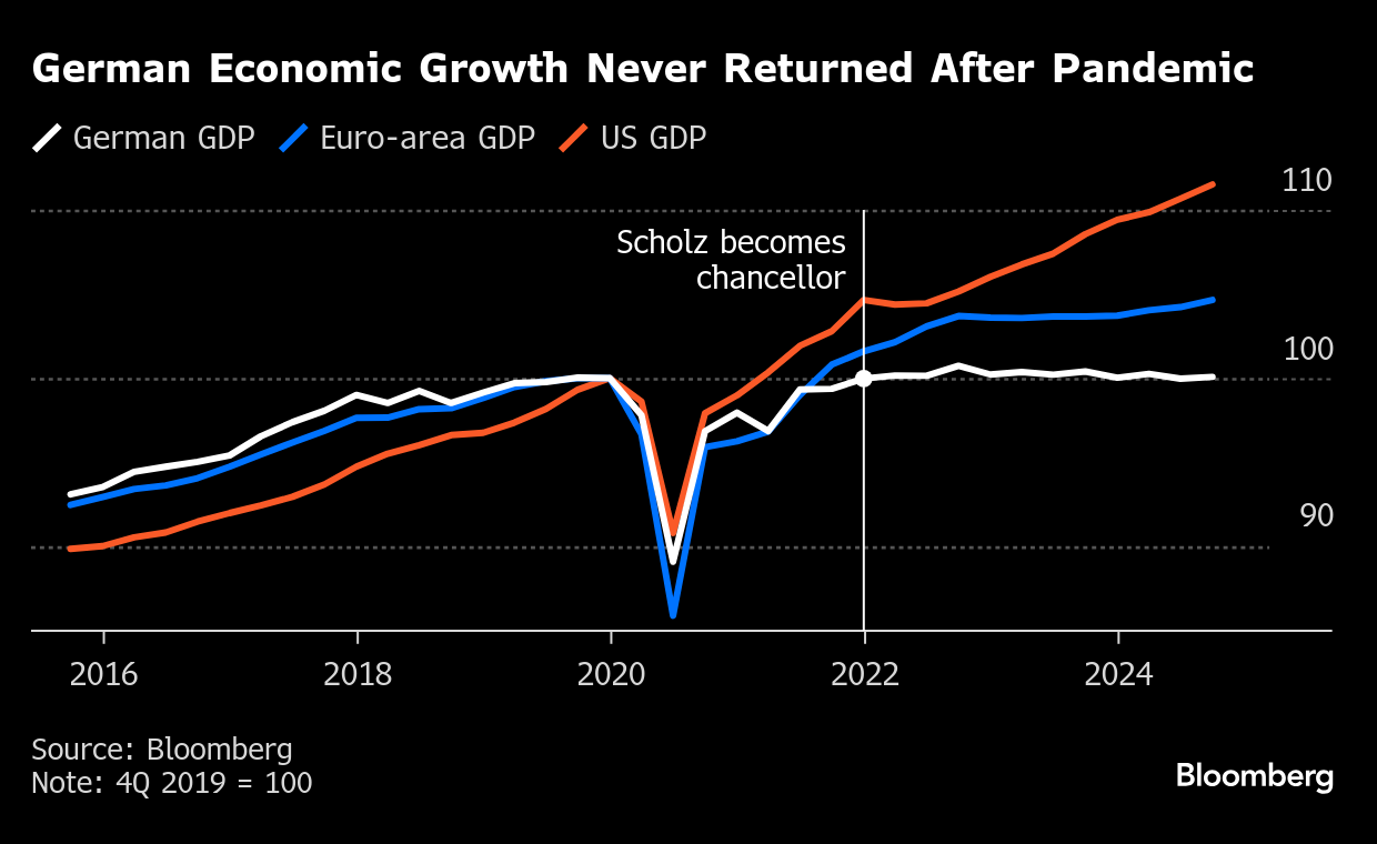 Germany’s failure to bounce back from the pandemic in the way that the US and other peers did has been the defining narrative during Scholz’s three-year term. Fixing Europe’s biggest economy after two years of contraction will be one of the next government’s key challenges.