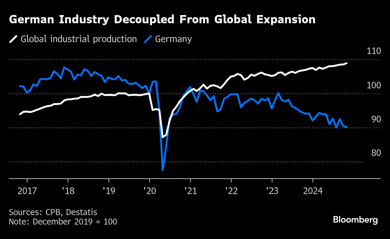 The decline in industrial production there contrasts with the global trend. According to the Kiel Institute for the World Economy, this decoupling signals that German companies have become less competitive.