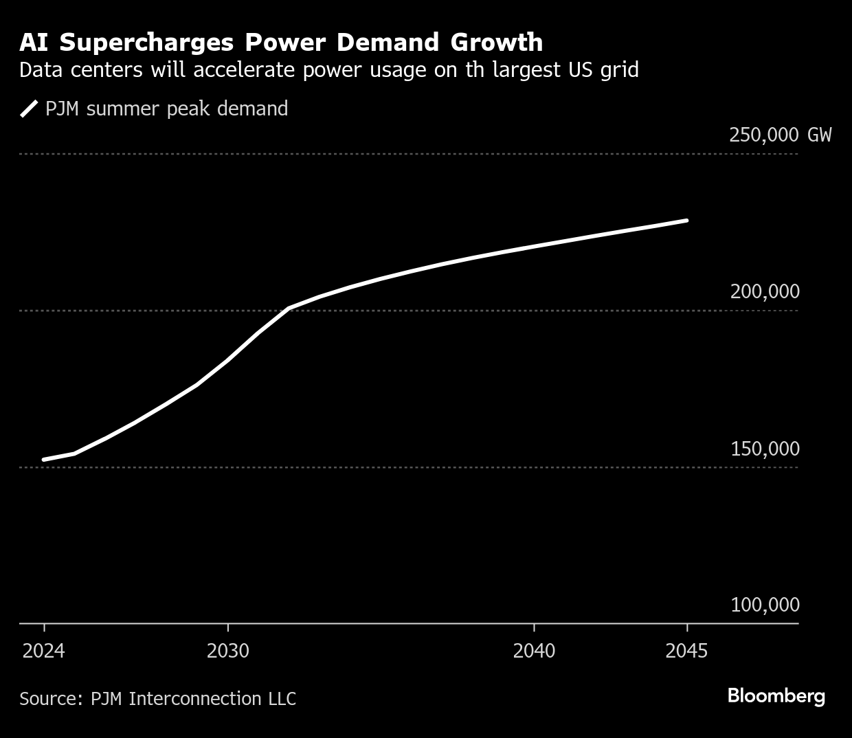 (Bloomberg) -- Electricity demand on the largest US grid is poised to rise so fast thanks to the AI boom that it’ll be the equivalent of installing two New England networks in the coming decade.