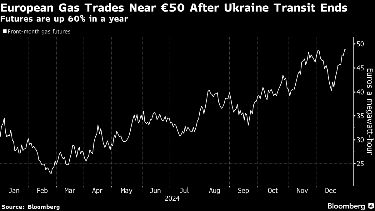 Benchmark gas for February delivery in the Netherlands climbed as much as 4.3%, but was up just 0.4% at €49.10 a megawatt-hour as of 11:20 a.m. in Amsterdam. Futures topped €50 on Dec. 31 in anticipation of the halt in flows.