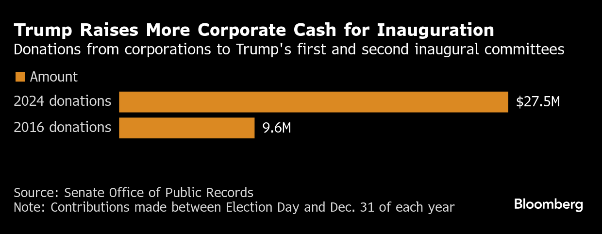 Crypto is just one of the many industries that lavished Trump with cash for his inaugural festivities. Many corporations who declined to give in 2016 — such as Amazon.com Inc., Meta Platforms Inc., Uber Technologies Inc. and Goldman Sachs Group Inc. — collectively spent millions in 2024.