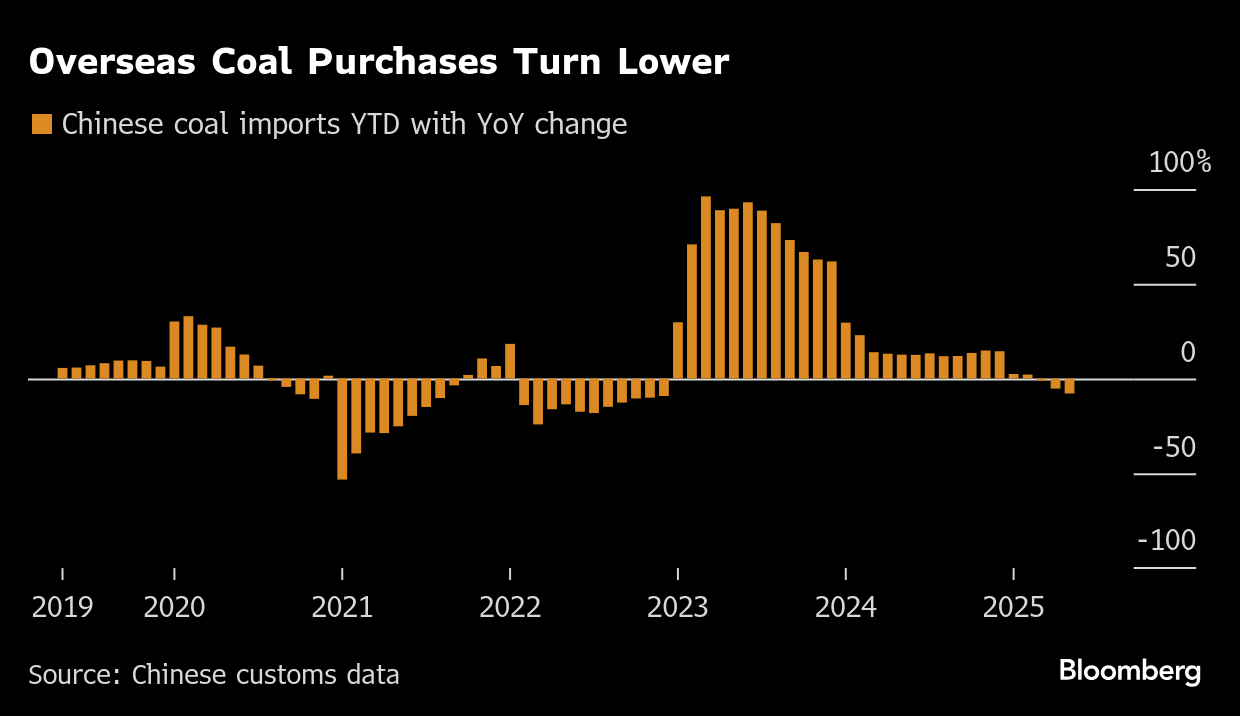 Coal imports fell year-on-year for a third straight month in May, and the decline is likely to accelerate over the rest of 2025, Li Xuegang, an analyst at the China Coal Transportation and Distribution Association, said Wednesday. The government’s “tighter emission controls will slash demand for low-heating and poor-quality grades,” Li told industry representatives at the annual Coaltrans event in Beijing.