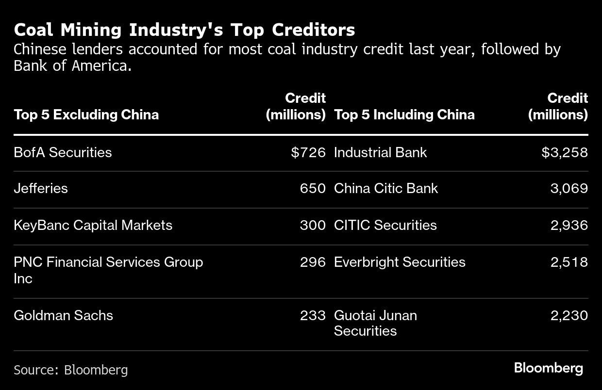 China-based firms accounted for more than 80% of loans and bonds issued for coal companies in 2024, and 19 of the 20 largest underwriting entities were all headquartered in the country, the data shows. Outside of China, Bank of America Corp. and Jefferies Financial Group Inc. were the leading providers.