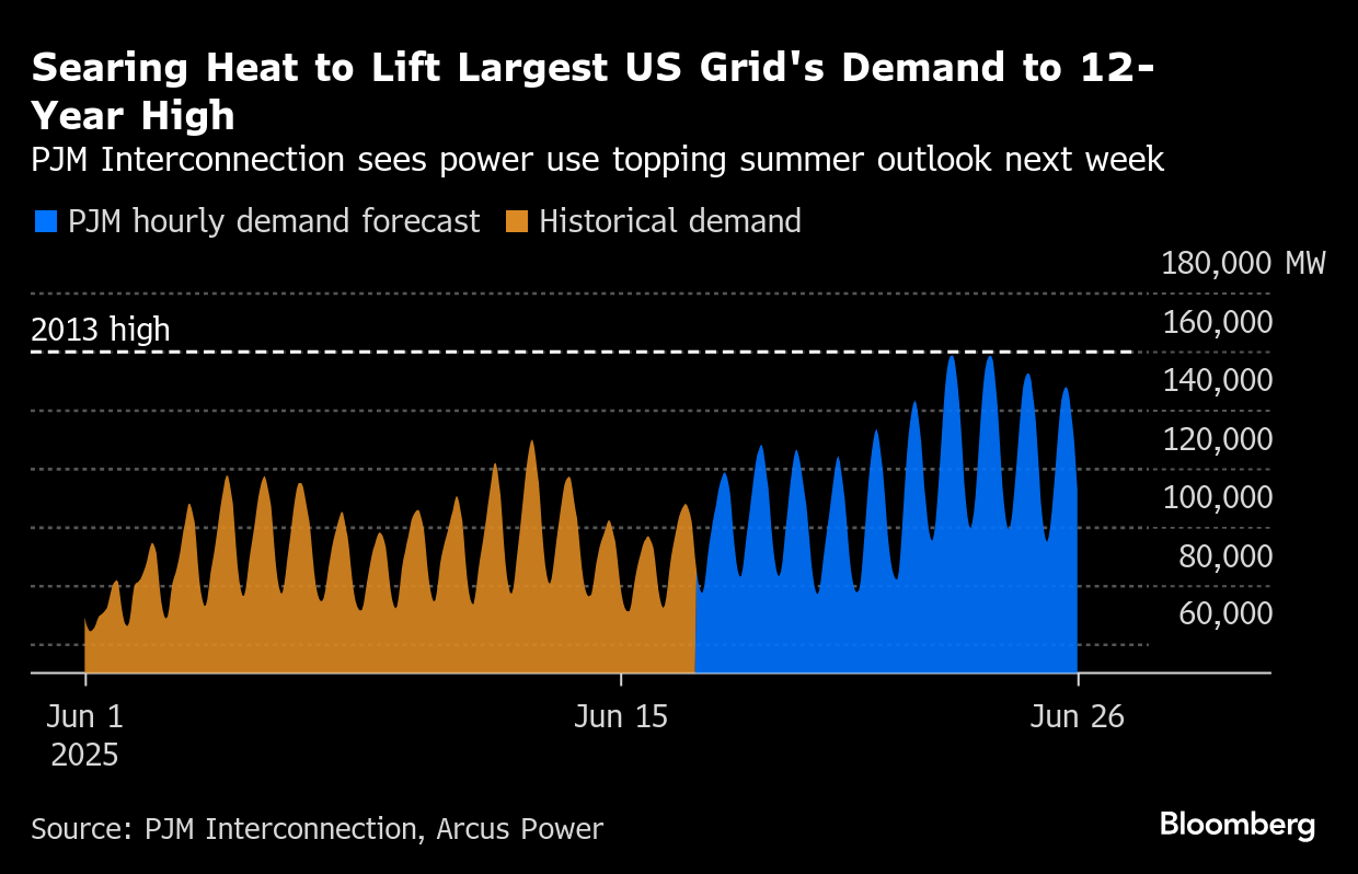 (Bloomberg) -- Electricity use on the biggest US grid, which serves nearly a fifth of Americans from Washington DC to Illinois, is expected to climb to a 12-year high as intense heat spurs air conditioning needs.