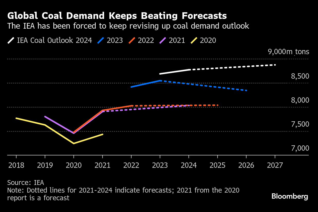 No surprise then, that the International Energy Agency has revised its coal demand outlook higher in its last four annual reports — and has reversed its view that demand would peak. Global demand is slated to rise 1% through 2027, the organization said in a December report.