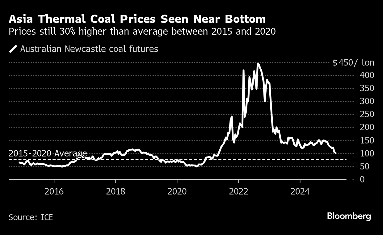 Australian thermal coal contracts, the benchmark for Asia, are hovering close to $100 a ton thanks to a mild winter and global oversupply, a price level last seen in May 2021, before the energy-market upheaval that followed Russia’s invasion of Ukraine. While that is battering producers and will cheer those predicting the end of the dirtiest fossil fuel, it’s a trough that may not last.