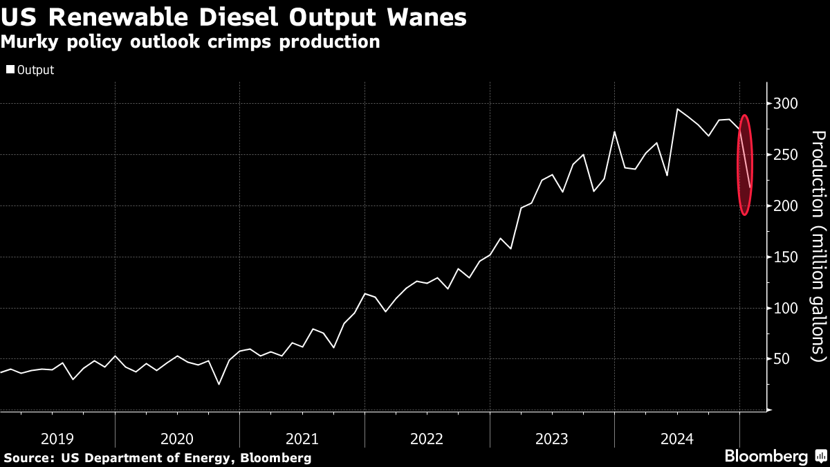 That led to a number of factory closures. Biodiesel plants in the US produced at just 51% of capacity in the year through April, while facilities that make renewable diesel — a fuel that’s chemically identical to its fossil fuel peer — ran at a rate of 72%, according to Bloomberg Intelligence’s Project Tracker.