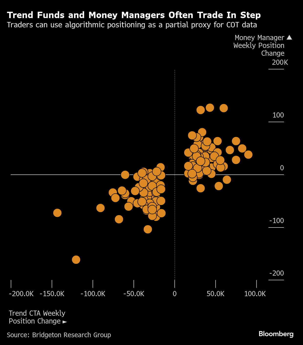 The shutdown is heightening the focus on alternative data providers. Firms like Energy Aspects Ltd. publish data that approximates positioning across oil and other commodity markets. Bridgeton Research Group LLC. offers insights on algorithmic trader positioning, which typically moves in tandem with that of money managers. But it is far from a complete picture. Algorithmic traders only make up roughly 15% to 20% of total speculator positioning covered in the COT reports, though “their positions are often more dynamic than other players,” according to Bridgeton.