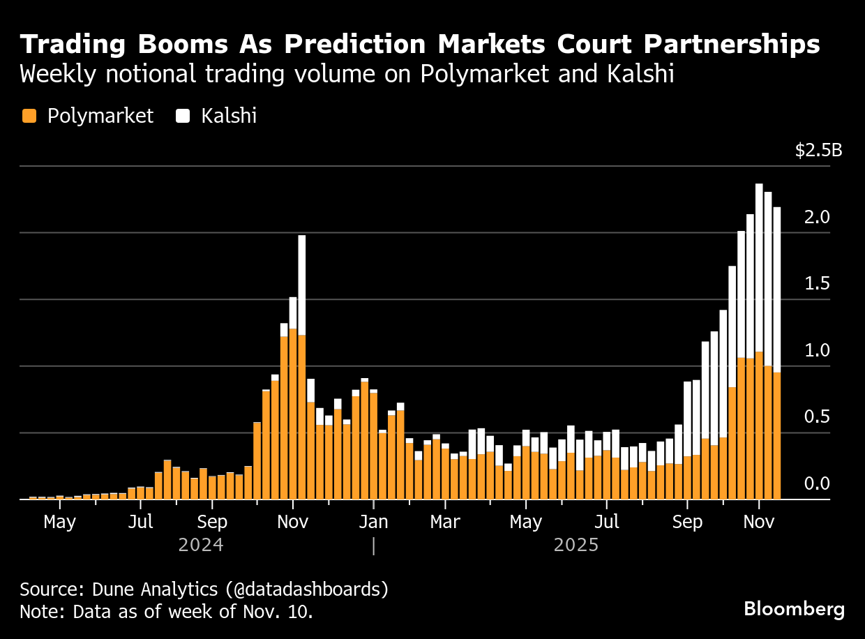 The recent agreements have helped Kalshi field offers to boost its valuation to more than $10 billion, from $2 billion in June, Bloomberg has reported. Polymarket has followed a similar parabolic ascent and it is now looking to raise additional funds at a valuation over $12 billion — more than 10 times what it was worth just months ago.