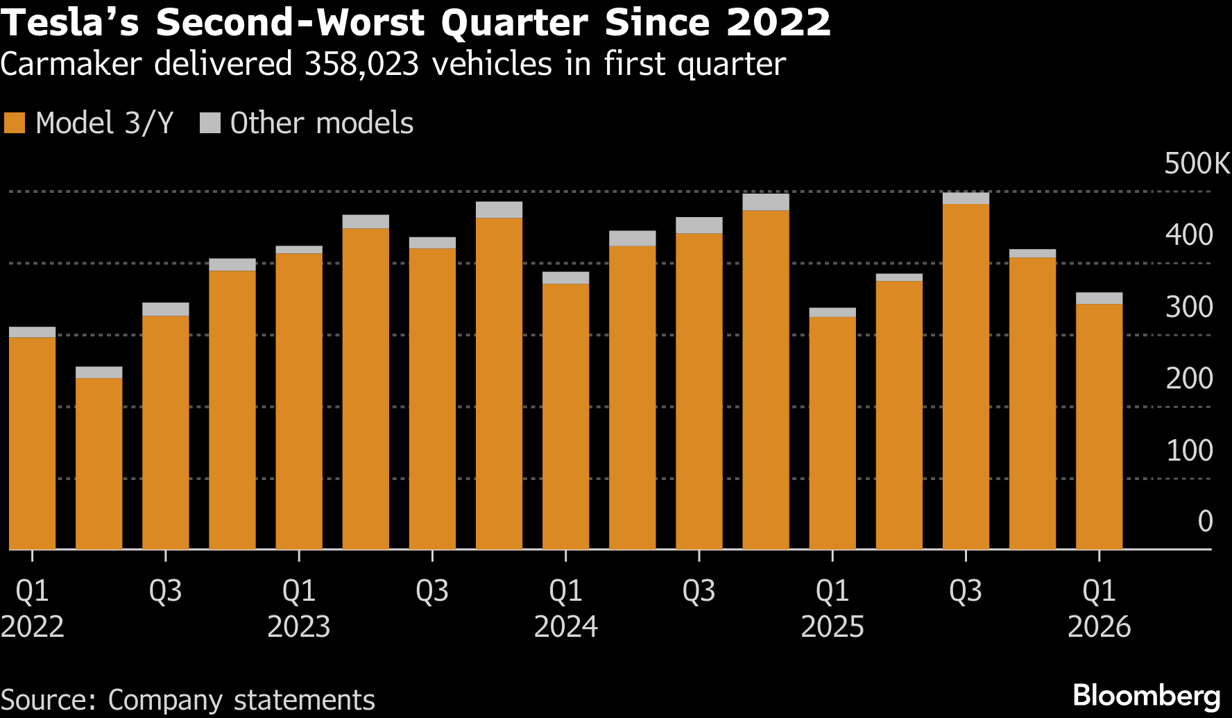 The company delivered 358,023 vehicles worldwide in the first quarter, according to a statement Thursday. Analysts anticipated 372,160 on average among estimates compiled by Bloomberg, a figure that steadily dropped in recent weeks. It’s the second consecutive quarter that Tesla has fallen short of projections.