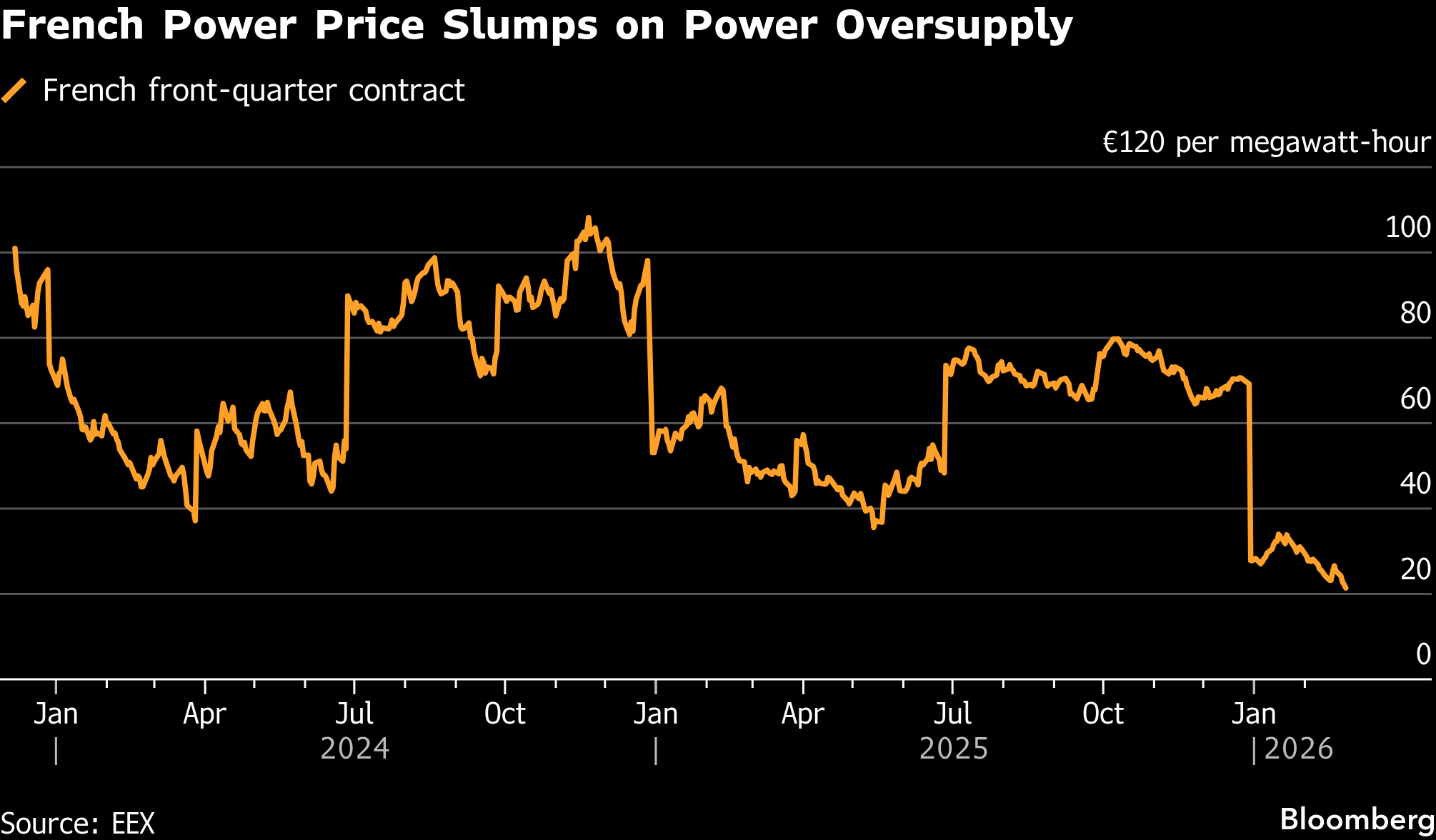Contracts for delivery in the next quarter fell to as low as €21.10 a megawatt-hour on the European Energy Exchange AG, the weakest level in six years. Prices in Spain are also sliding sharply as surging wind and solar generation floods the grids.