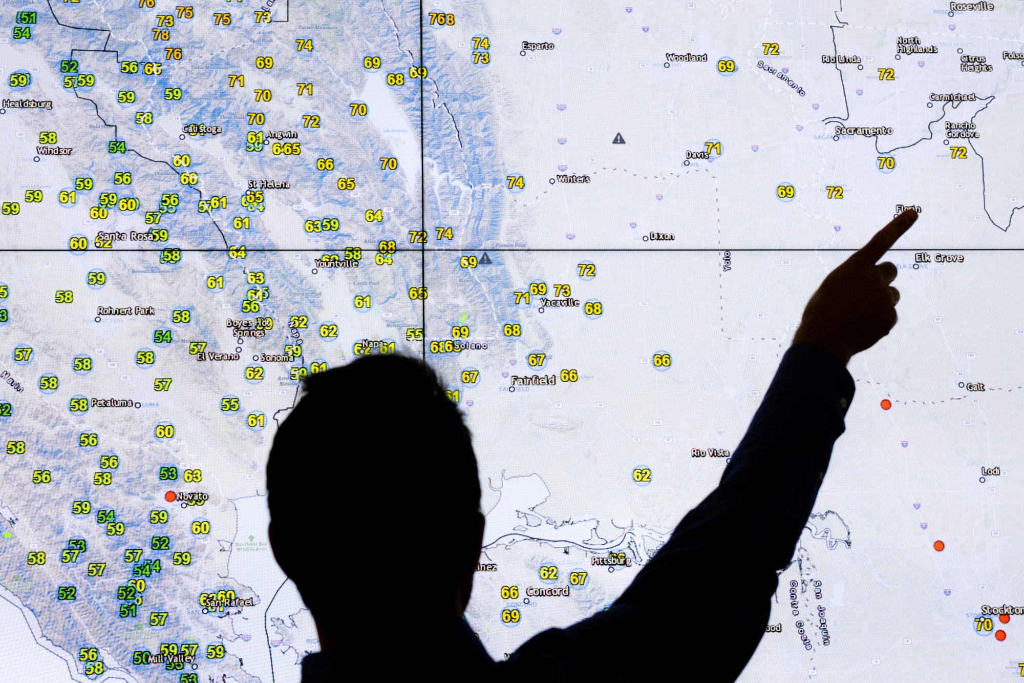 In a control room in PG&E’s San Ramon, California office, a giant map looms, dotted with transmission lines, cutting across mountains and valleys, running alongside rivers and streams. It’s here that Scott Strenfel, PG&E’s senior director of meteorology and fire science, along with his team of seven forecasters, monitors the weather and decides when the risk of fire is too great to keep energy flowing across the utility’s vast transmission and distribution system.