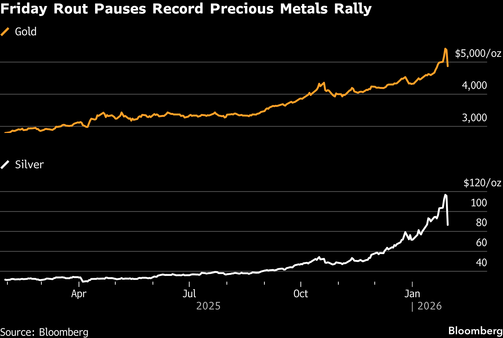 Gold and silver suffered their biggest slide in years, in a whipsawing reversal of a scorching rally that lifted prices to all-time highs. The selloffs were triggered by the dollar rebounding after a report that Trump was preparing to nominate Warsh for Fed chair, which was later confirmed.