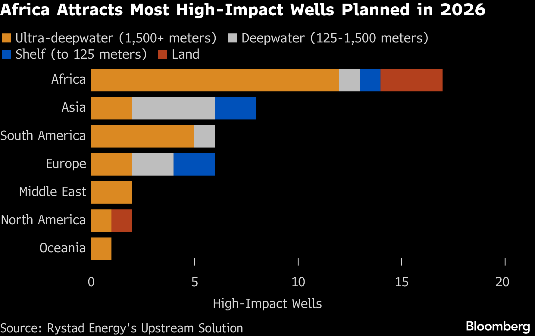 Africa is drawing marquee oil majors this year, with companies planning to drill more than twice as many high-impact exploration wells as any other region in the search for future reserves.