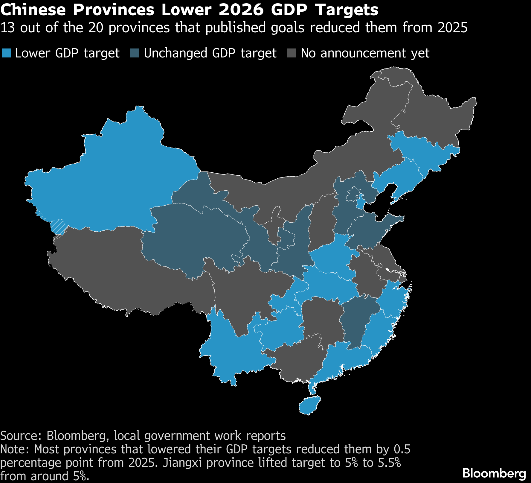 Over a dozen Chinese provinces have reduced their economic growth targets for 2026, pointing to a likely downgrade of the national goal for the first time in four years. Such a change would signal authorities are adopting a more pragmatic approach toward managing the economy in the face of challenges including sluggish consumer spending.