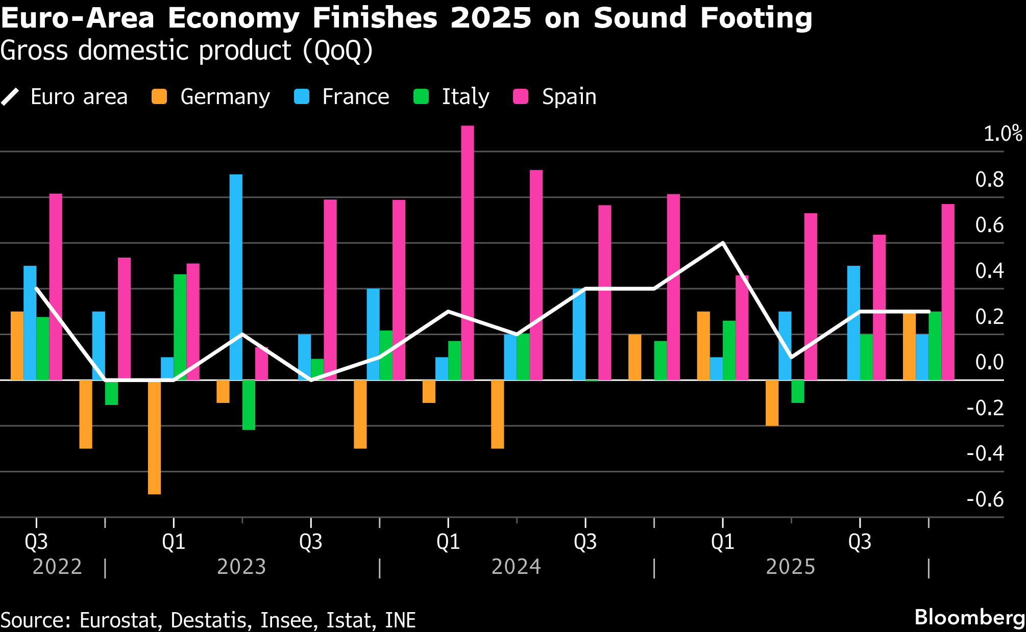 The euro-area economy grew more than expected at the end of last year, demonstrating resilience to trade turmoil. Germany, Italy and Spain all surpassed estimates, with the latter proving the standout performer.