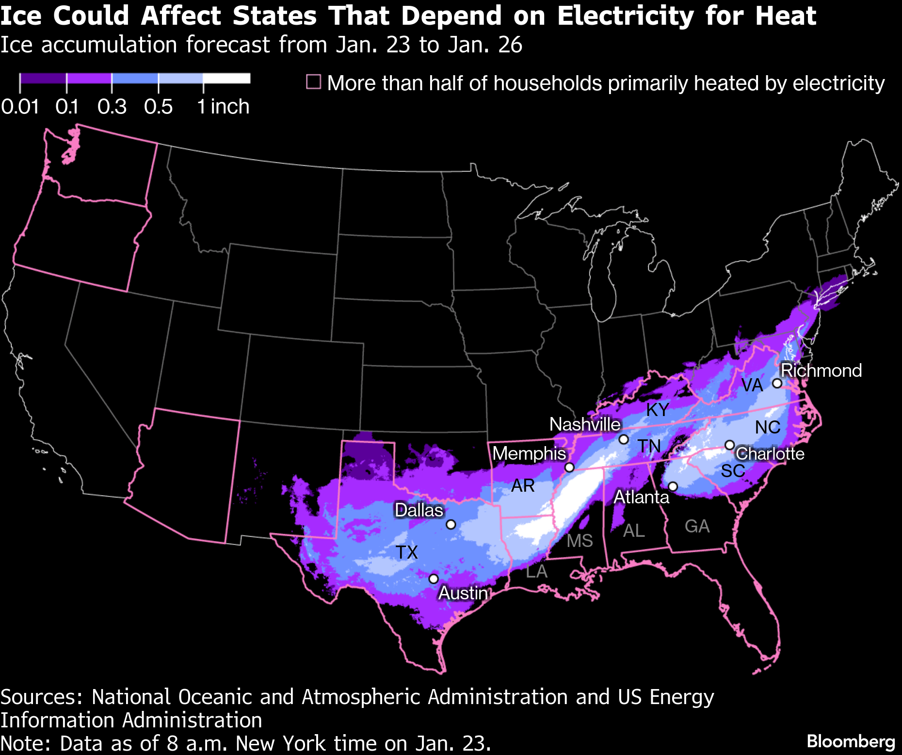 Through Monday evening, Nashville and Charlotte could see roughly a half-inch (1.3 centimeters) of freezing rain. That’s enough to snap tree branches and power lines, potentially triggering widespread power outages. Parts of Mississippi will be lashed with more than an inch of ice.