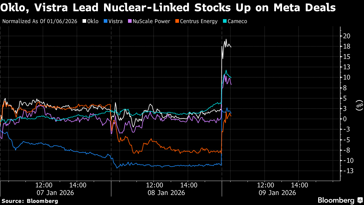 (Bloomberg) -- Oklo Inc. and Vistra Corp. shares rallied, leading peers higher, after Meta Platforms Inc. agreed to a purchase nuclear power from the companies to run artificial-intelligence data centers.
