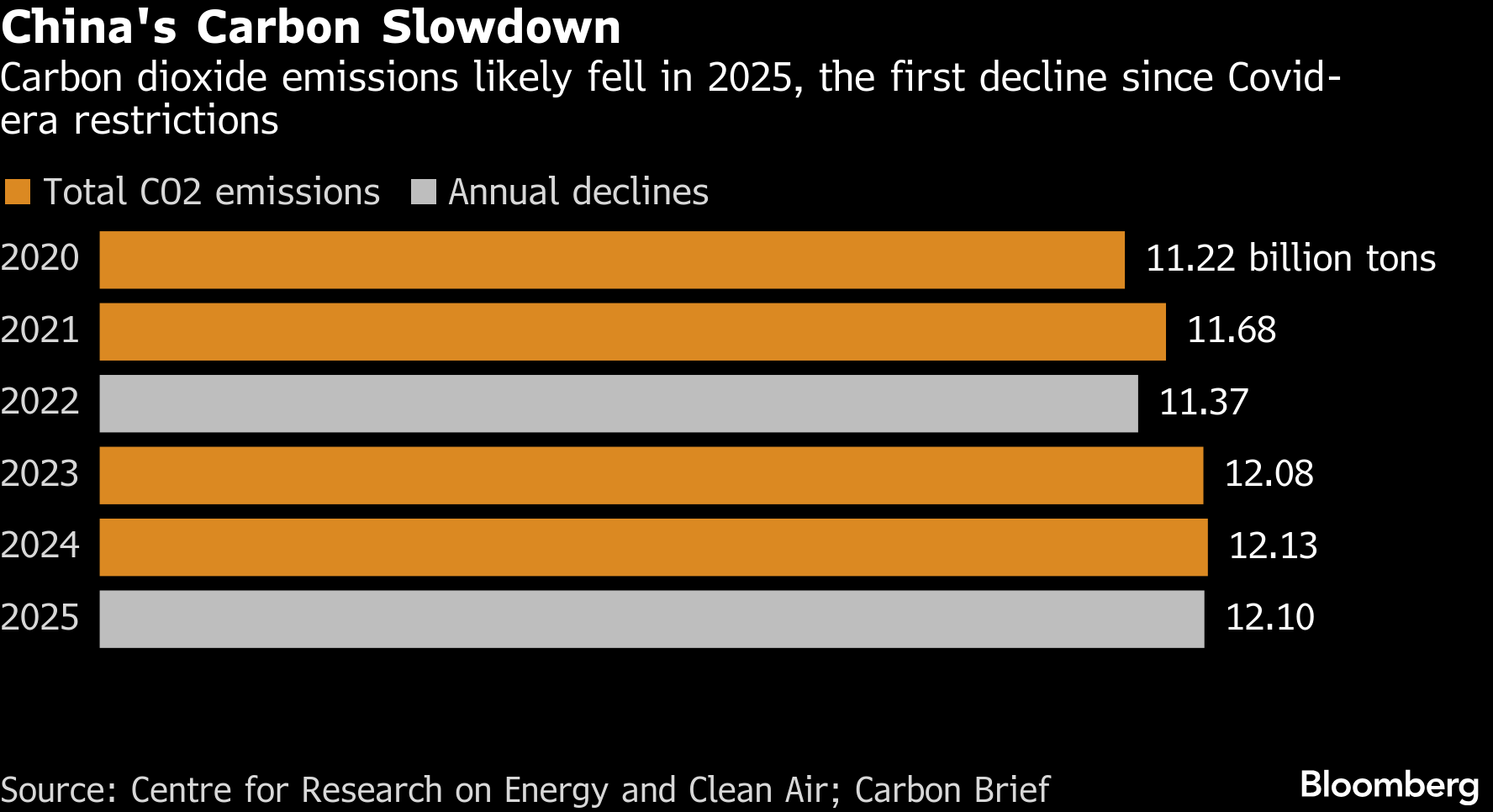 There have been recent signs of progress in China. Carbon emissions likely fell 0.3% in 2025, a first decline since Covid-era curbs, the Centre for Research on Energy and Clean Air, or CREA, said last month. World-leading adoption of renewable energy means China is now meeting growing electricity consumption without the need to burn more coal at power plants, while the dramatic rise of EVs has eroded demand for transport fuels.