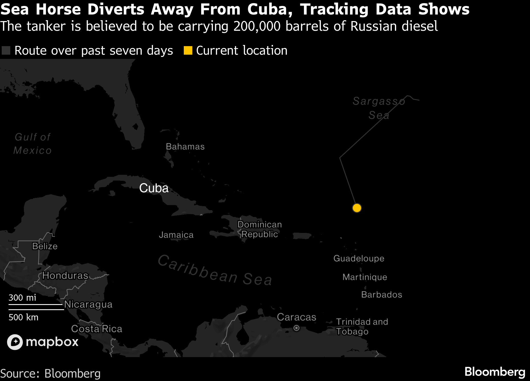 The Sea Horse, likely carrying 200,000 barrels of Russian gas oil, had earlier posted its new destination as neighboring Trinidad and Toboago and was heading that way as of Friday, according to ship-tracking data compiled by Bloomberg. Last month, the tanker abruptly halted its voyage in the middle of the North Atlantic amid a de facto US fuel blockade of the island.