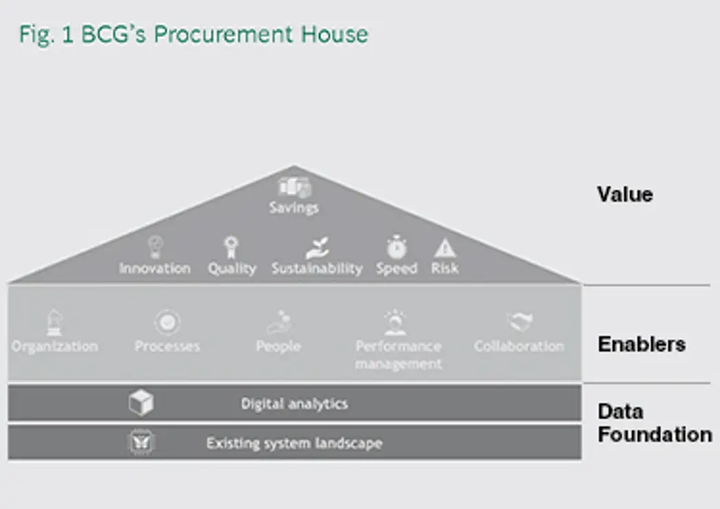 Jumpstart to Digital Procurement introduces BCG’s Procurement House, which comprises the three main dimensions of the authors’ approach: value, enablers, and data foundations. A company must identify the primary value it wants procurement to generate and the enablers that best support this value. It can then choose the right digital tools and applications.