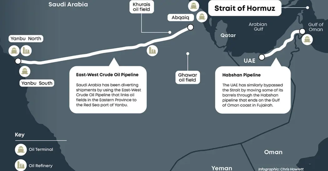 Both Saudi Arabia and the UAE have alternative shipping routes at their disposal, partially mitigating the impact of disruption. According to the US Energy Information Administration (EIA), about 2.6 million barrels per day (bpd) of unused capacity from existing UAE and Saudi pipelines could be available to bypass the Strait of Hormuz.